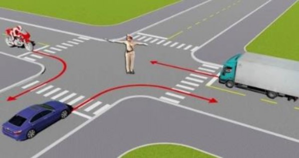 Khi gặp hiệu lệnh điều khiển của Cảnh sát giao thông như hình dưới đây thì người tham gia giao thông đường bộ phải đi như thế nào là đúng quy tắc giao thông?